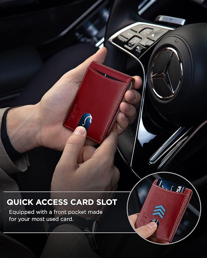 - SLIM AND STYLISH - Made with the Finest Full Grain leather, Top Grain Leather and Vegan Leather. Designed Quick Access ID Windows, Best Fits 6-8 cards plus US bills with no bulk, and a minimal Pull-tab design to reduce bulk - Wallet Size: 3.9" in. x 2.85" in. 0.5" in.