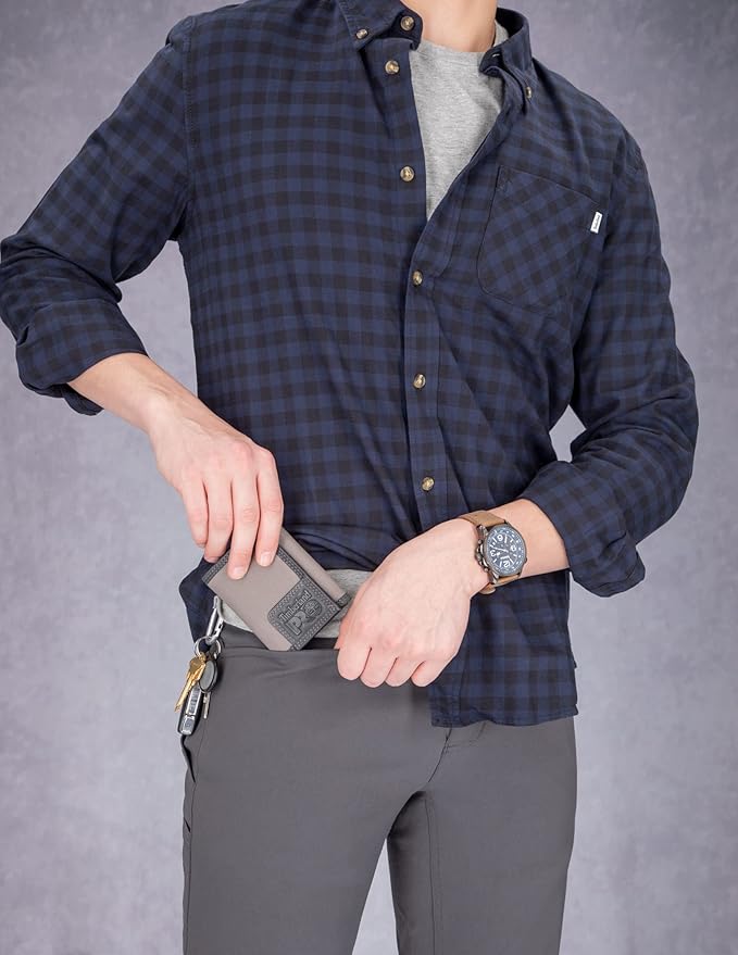- CANVAS & LEATHER MENS WALLET: The Timberland Pro Men’s trifold Wallet is a thin-designed wallet made from a durable canvas material that is designed to fit perfectly in jeans, dress slacks and shorts.