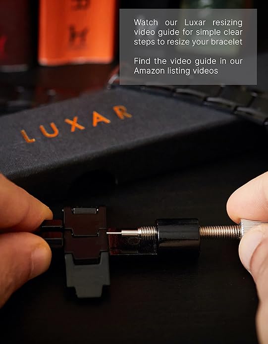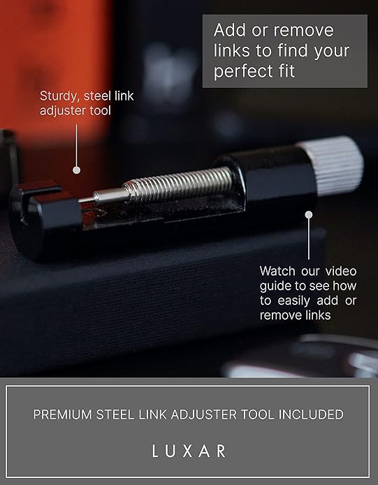 - ☑️ ADJUSTABLE SIZE - one size fits all men (up to a maximum of 9" wrist circumference - additional links are available on request if a larger size is required - please just send us a message!) Use the premium quality steel Luxar link adjuster tool to add or remove links for the perfect fit [adjuster tool included].