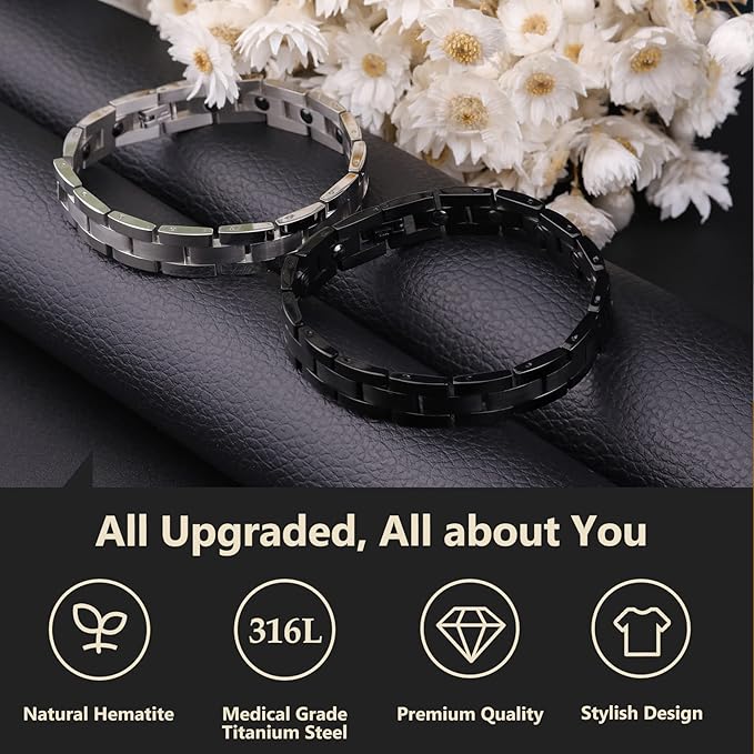 - Titanium Magnetic Bracelet for Men: The men's bracelet is made of sturdy titanium steel. Titanium steel is a superior material in jewelry making, as it's lead and nickel-free, hypoallergenic, waterproof, scratch-resistant, corrosion-resistant, and resistant to oxidation.