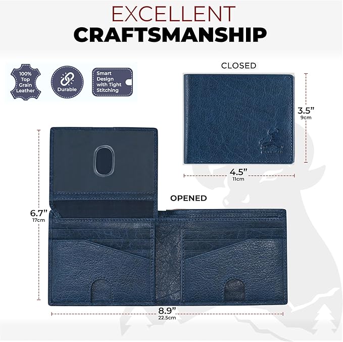 - One Of A Kind With Generous Bifold Size: At 3.5"H x 4.5"W our traditional men's wallet is spacious and boasts plenty of room and capacity. It was designed for the man on-the-go - the adult that appreciates handsome aesthetics, top-notch quality, functional and stylish design. This versatile, comfortable wallet in classic bifold size holds all your valuables while traveling, working or when enjoying sports or outdoors. Fashionable, sleek wallet for business or outdoors.