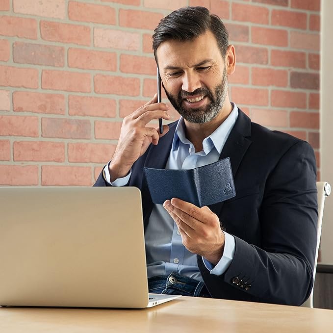 - Smart Design: This bifold wallet for men has a unique easy to use and carry design with an impressive storage capacity: 1 see-through ID, 11 card compartments, with 3 easy-access card slots with thumb access,2-pocket money divider, 2 slip-in-pockets. With plenty of storage and simple access, this bifold wallet was crafted for efficiency and extra capacity. Great wallet for travel, outdoors, sports, bikers. Then take this beauty straight back to an executive meeting or a date
