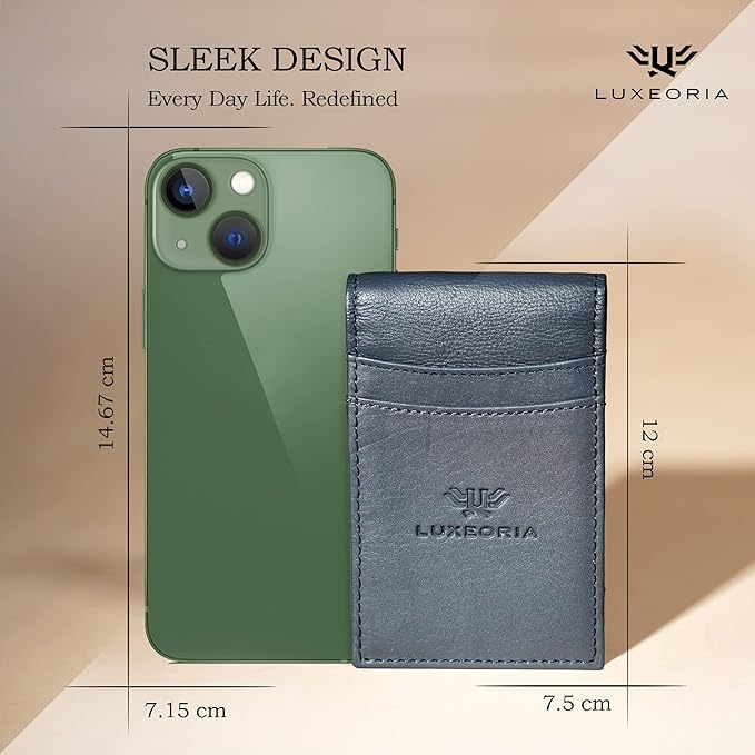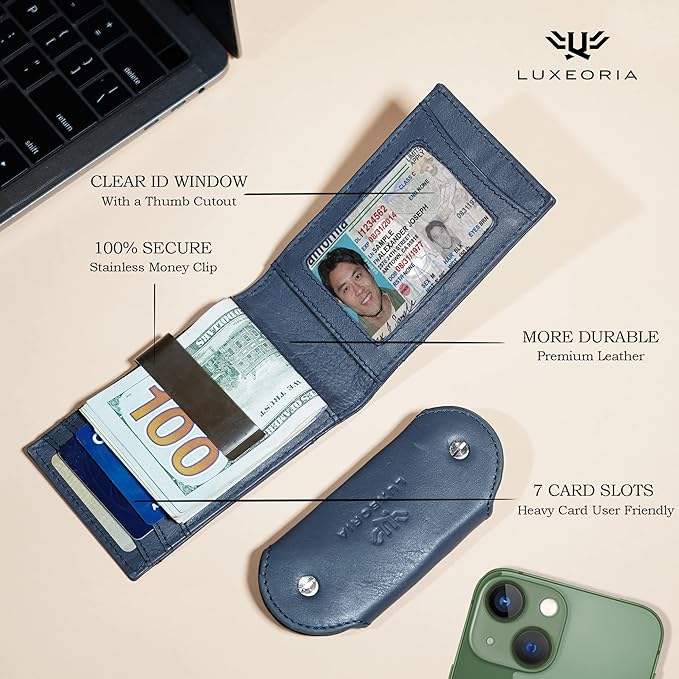 LUXEORIA Full Grain Genuine Leather Moneyclip Wallet for Men, Handcrafted Travel Wallet, Slim Mens Wallet, RFID Wallet for Men - Card Holder, 10 Card Slots -Navy