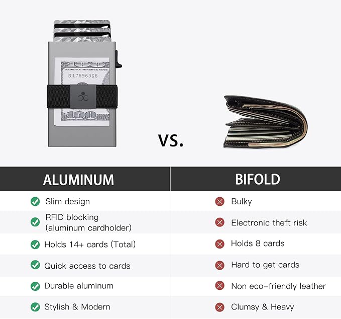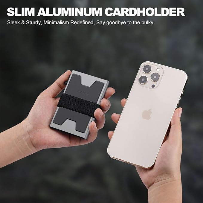 - π³ ULTRA THIN PROFILE: The Minimalist tactical wallet is very thin and can be carried comfortably in a front pocket. The aluminum cardholder size is 3.9*2.5*0.5in,weight only 2.6oz . And expandable backplate designed for additional storage. Ditch the bulk, less is more.