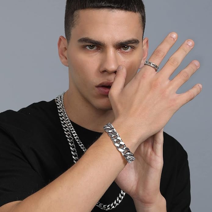 Stainless Steel Bracelets for Men,Cuban Link Mens Bracelet Silver/Black/Gold Plated Classic Chain Wrist Bracelets Jewelry Gifts for Dad Husband 5/7/9/12MM Width,7.5"/8.3"/9" Length with Gift Box
