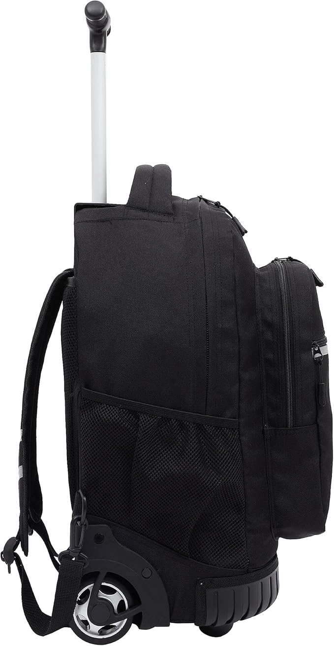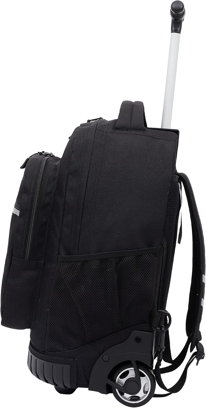 - Telescopic locking handles: The backpack features telescopic handles that can be extended and locked into place, providing a convenient and ergonomic way to pull the backpack when it's rolling