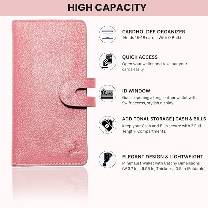 - SPACIOUS & FUNCTIONAL DESIGN: This wallet for women is crafted for ultimate organization, Holds 15-18+ card slots, 1 ID window, 2 full-length cash compartments, made from premium leather, this women wallet offers both durability and style. Designed as women's wallets, it provides RFID blocking card protection to keep your personal data safe. Perfectly fits in wallets for women, making it an ideal everyday companion & gift.
