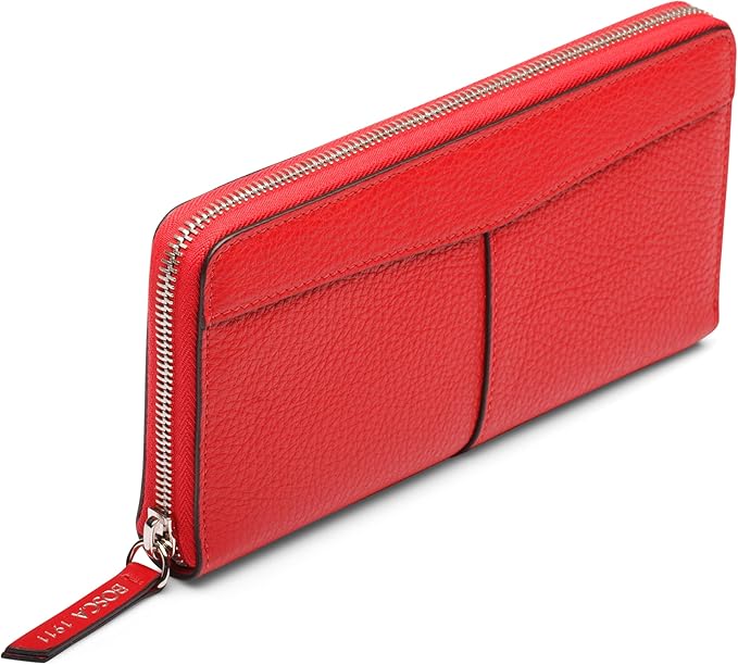 Bosca Womens Wallet - Slim Italian Leather Zip 8" Wallet For Women, Handmade in Italy - 12 Card Pockets, 2 Bill/Phone Pockets, Zipper Coin Pocket, Red