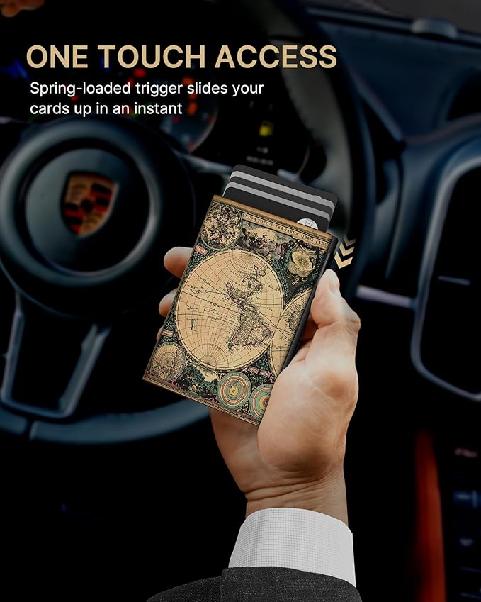 - 【QUICKEST ACCESS】Instant card access at the tap of a button by a single hand. Stores 10-15 cards and 15 bills total. The pop-up aluminum card holder stores 6-7, the built-in cash slot stores 50+ bills, and the ID window for driver's licenses.