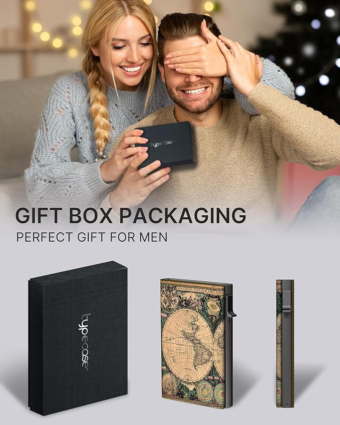 typecase Mens Wallet Card Holder: Pop Up Aluminum Case, Carbon Fiber Leather, Smart, RFID Blocking, Slim, Minimalist, Front Pocket - 9-14 Card Capacity | ID Window | Cash Slot (Map)