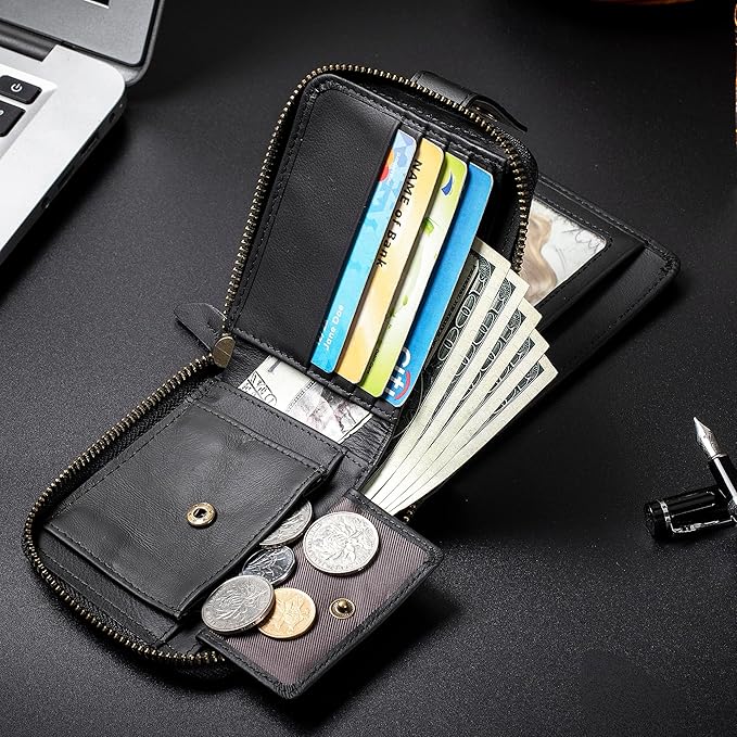 - Men Wallet with Zipper : Large Capacity: 13 card slots + 2 cash compartments + 1 driver's license / ID/ photo window + 1 magnetic buckle coin bag. It’s easy to carry all your important cards and meets all your daily needs.