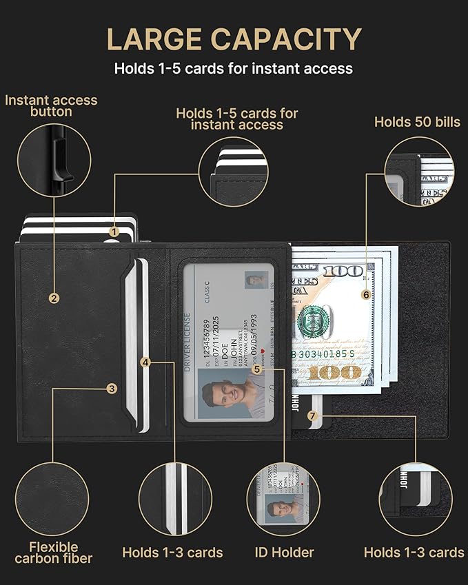 - ๐๐ณ๐ณ๐ถ๐ฐ๐ถ๐ฒ๐ป๐ ๐๐ฎ๐ฟ๐ฑ ๐๐ฐ๐ฐ๐ฒ๐๐: Designed for speed, this wallet's Smart Pop Up mechanism allows you to instantly view and select your cards.