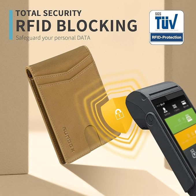• RFID Blocking - Our wallets are equipped with advanced RFID SECURE Technology, a unique metal composite, engineered specifically to block 13.56 MHz or higher RFID signals and protect the valuable information stored on RFID chips from unauthorized scans. License and ID cards will be protected effectively. Blocking the 13.56 MHz band and protect against data theft by RFID scanners