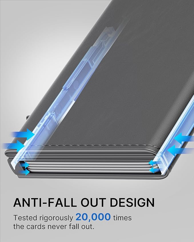 - 【QUICKEST ACCESS】Instant card access at the tap of a button by a single hand. Stores 10-15 cards and 15 bills total. The pop-up aluminum card holder stores 6-7, the built-in cash slot stores 50+ bills, and the ID window for driver's licenses.