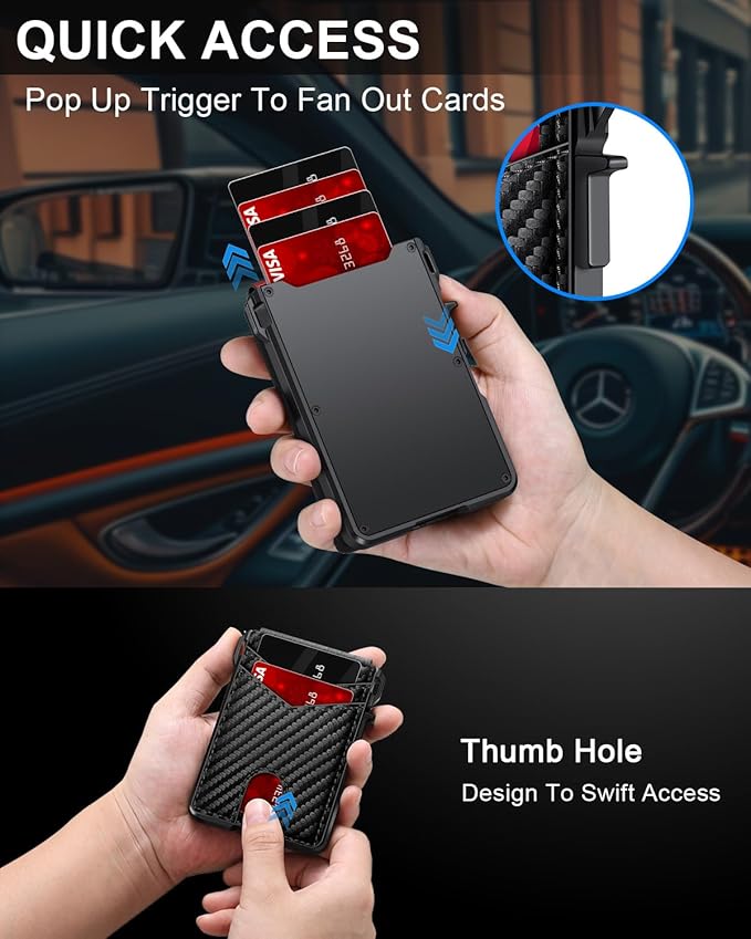 - QUICK ACCESS: Unlike traditional leather wallet, this mens slim wallet is equipped with the ejection mechanism. Simply press the side button on the card holder, all cards pop up at a step pattern that makes them very easy & convenient to take out.
