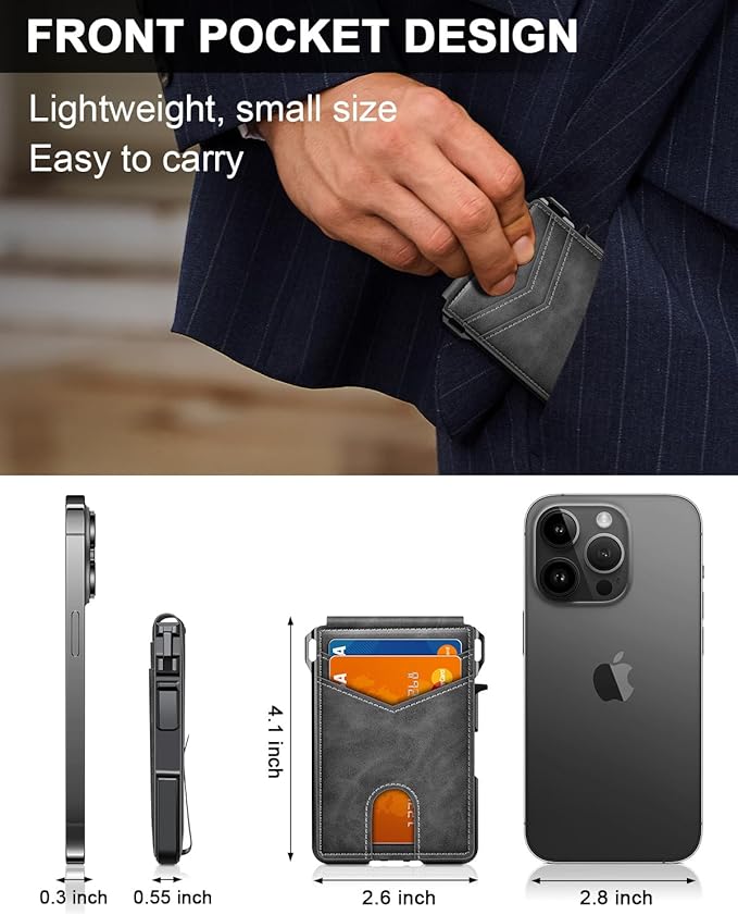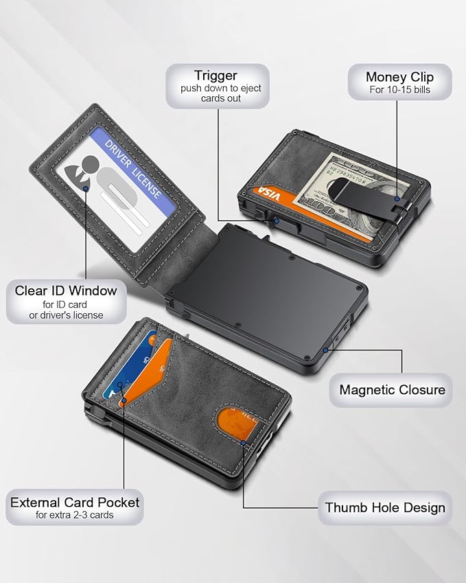 - QUICK ACCESS: Unlike traditional leather wallet, this mens slim wallet is equipped with the ejection mechanism. Simply press the side button on the card holder, all cards pop up at a step pattern that makes them very easy & convenient to take out.