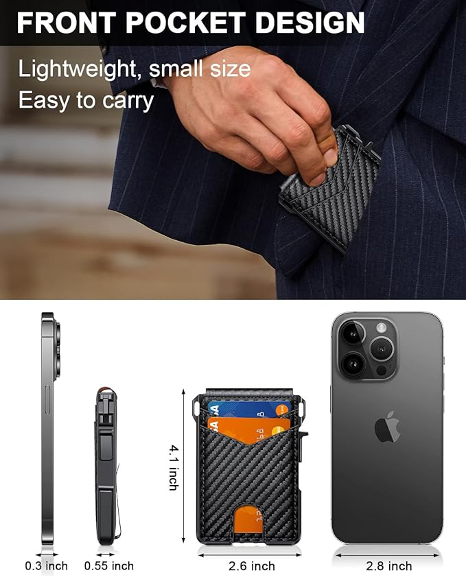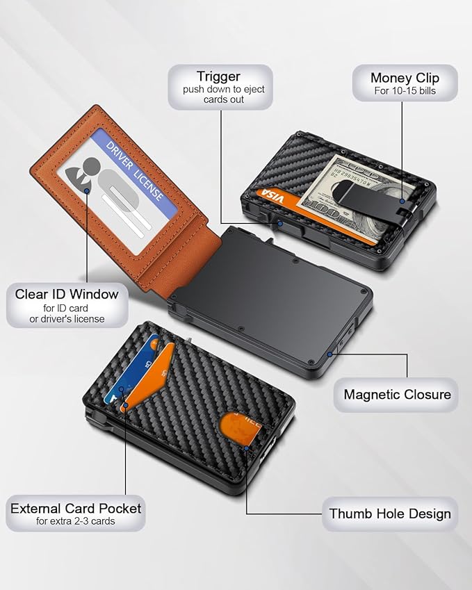 - CLEAR ID WINDOW: On the inside of the carbon fiber wallet, which has an ID card holder slot, which allows you to swipe the card without removing the card. It can be used to store ID card, work card, driver license, access card, traffic card, etc.