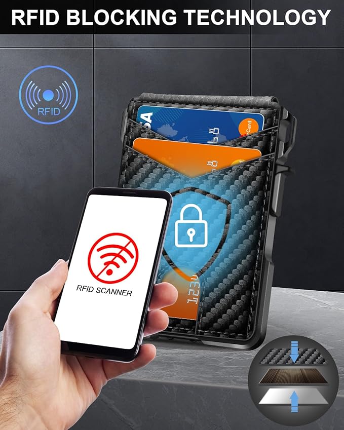 - RFID BLOCKING: This rfid wallet for men embeds a chip in the aluminum card case to block unknown scanning devices from scanning your credit cards, debit cards, and driver's licenses, maximizing the protection of your personal property.