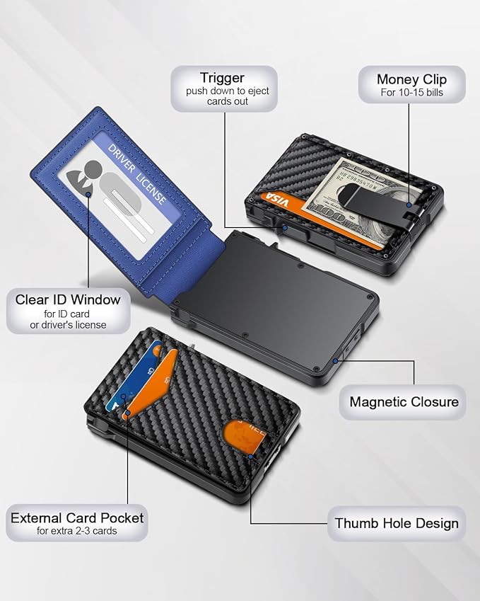 - CLEAR ID WINDOW: On the inside of the carbon fiber wallet, which has an ID card holder slot, which allows you to swipe the card without removing the card. It can be used to store ID card, work card, driver license, access card, traffic card, etc.
