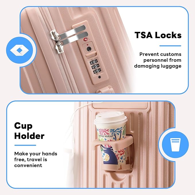 • 【USB Port & Cup Holder 】Multi Functional Design Luggage with USB Interface (Excluding Portable Power Bank), can Quickly Connect to Your Portable Electronic Device for Charging. Luggage with a Cup Holder also, Allowing You to Carry Drinks Hands-Free and Free Your Hands. Make Your Travel More Free