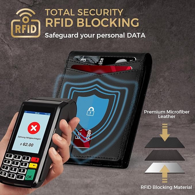 - RFID BLOCKING PROTECTION - Our wallets are equipped with advanced RFID SECURE Technology, featuring a unique metal composite material engineered specifically to block RFID signals of 13.56 MHz or higher. This effectively protects sensitive information stored on RFID chips from unauthorized scans, ensuring comprehensive security for driver’s licenses and ID cards. It reliably blocks the 13.56 MHz frequency band, preventing data theft by RFID scanners