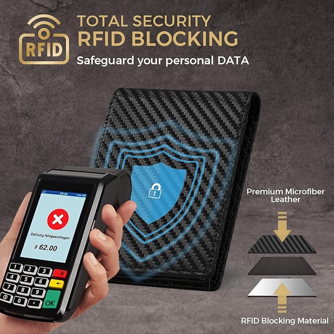 - RFID BLOCKING PROTECTION - Our wallets are equipped with advanced RFID SECURE Technology, featuring a unique metal composite material engineered specifically to block RFID signals of 13.56 MHz or higher. This effectively protects sensitive information stored on RFID chips from unauthorized scans, ensuring comprehensive security for driver’s licenses and ID cards. It reliably blocks the 13.56 MHz frequency band, preventing data theft by RFID scanners