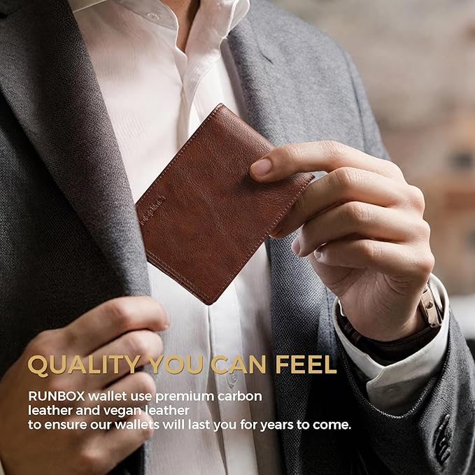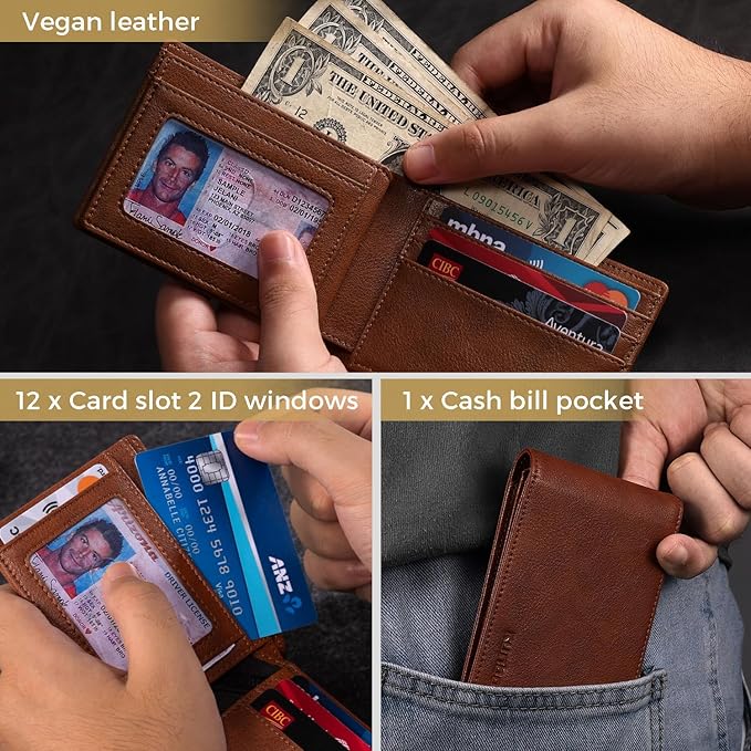 - VEGAN LEATHER WALLET— Expertly crafted, this men's wallet features high-quality carbon leather—a non-animal material that matches traditional leather's luxury and durability without animal harm. Water- and abrasion-resistant, it softens with use for easy card access and ages beautifully over time, with long-lasting functionality