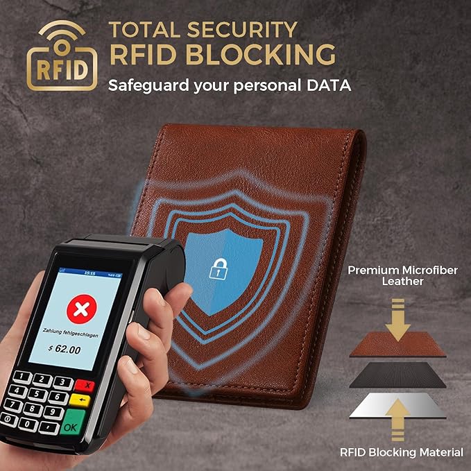 - RFID BLOCKING PROTECTION - Our wallets are equipped with advanced RFID SECURE Technology, featuring a unique metal composite material engineered specifically to block RFID signals of 13.56 MHz or higher. This effectively protects sensitive information stored on RFID chips from unauthorized scans, ensuring comprehensive security for driver’s licenses and ID cards. It reliably blocks the 13.56 MHz frequency band, preventing data theft by RFID scanners