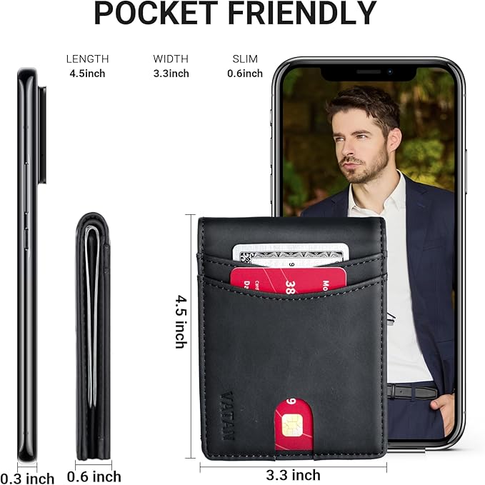- SLIM BIFOLD WALLET: This minimalist wallet measures 4.5x3.3x0.6 inches, this bifold slim wallet for men can hold up to 15 cards. Its slim profile slips effortlessly into your pocket, making it an ideal choice for everyday carry.