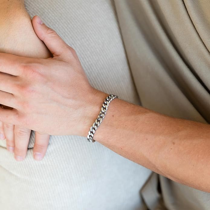 - Elevated Craftsmanship: The Cuban Chain Bracelet Silver is meticulously crafted from premium 316L stainless steel, plated in 925 silver for a brilliant, polished finish. Its tightly linked Cuban chain design embodies refined strength and everyday sophistication, making it a must-have essential for any collection.