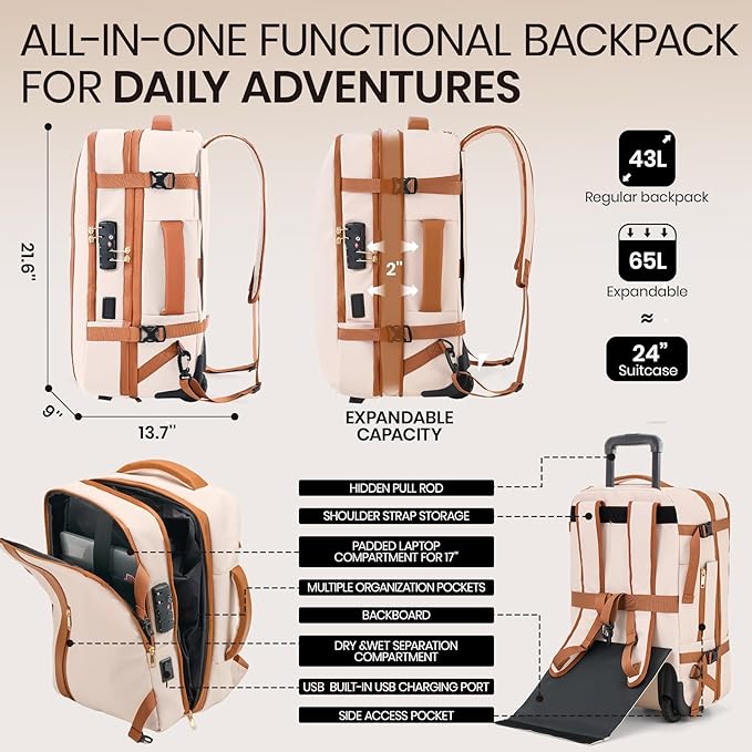 Fanwoli Rolling Vacuum Backpack Travel with One-Button Compression, Expandable Carry-On Suitcase Luggage, Approved TSA Lock & Water-Proof Laptop Compartment for Outdoor/Family/Business Trips